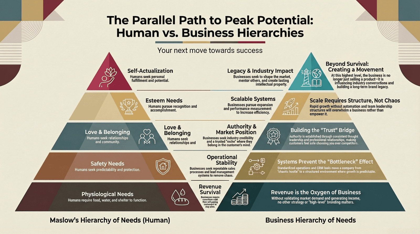 If a business tries to pursue higher-level strategies before meeting its foundational needs, growth becomes unstable.